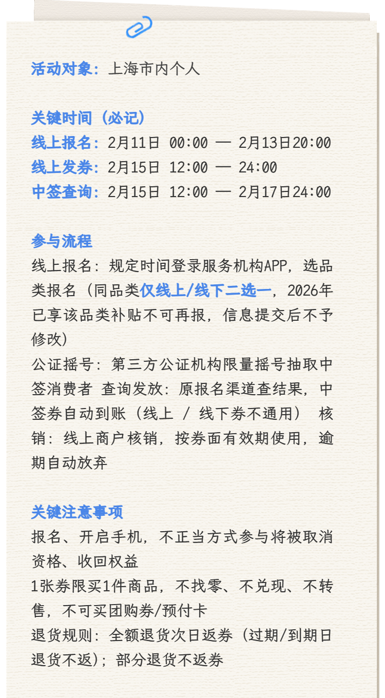 委先容市商务,新、数码和智能产物购新补贴战略推行细则》凭据《上海市2026年落实国度家电以旧换,、数码和智能产物购新”补贴资历券我市将发放第四轮“家电以旧换新。费者报名事宜布告如下现就线上补贴运动消↓